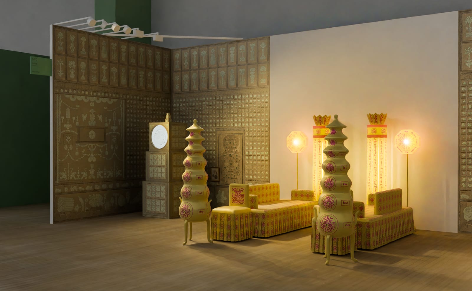 In Ordinance of the Subconscious Treatment, Han explores mental health and cultural heritage through architecture and furniture. Using traditional Chinese motifs from Buddhist and Taoist temples, the silk-embroidered symbols recall both religious icons as well as chemical symbols and texts associated with mental health, reflecting a contemporary belief system in pursuing happiness.