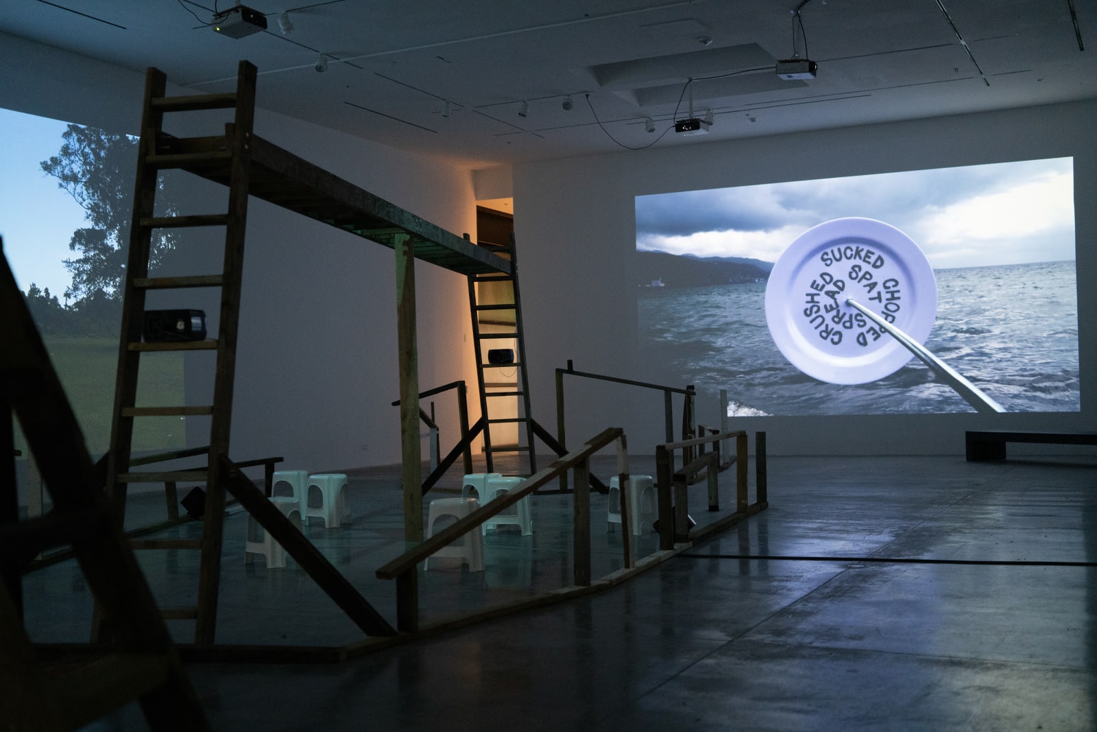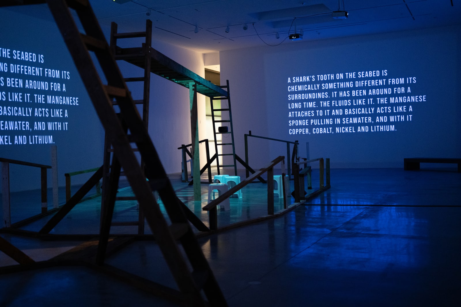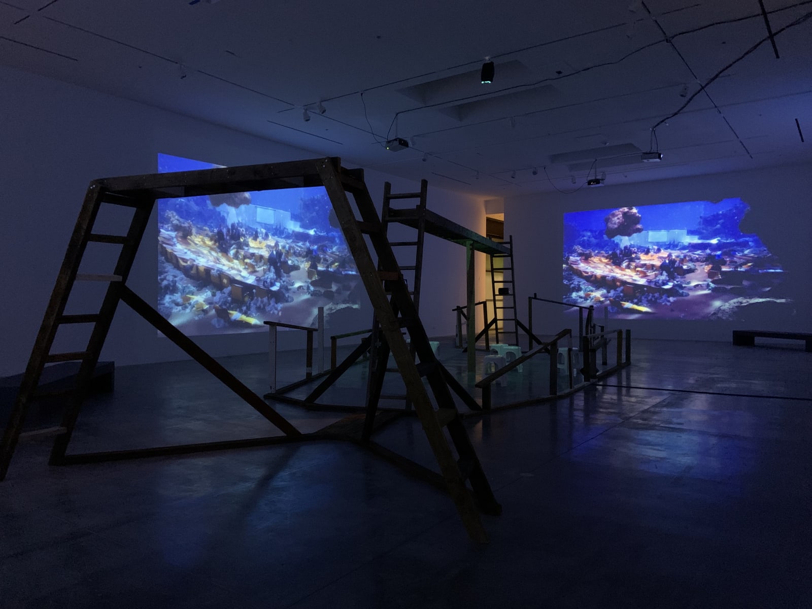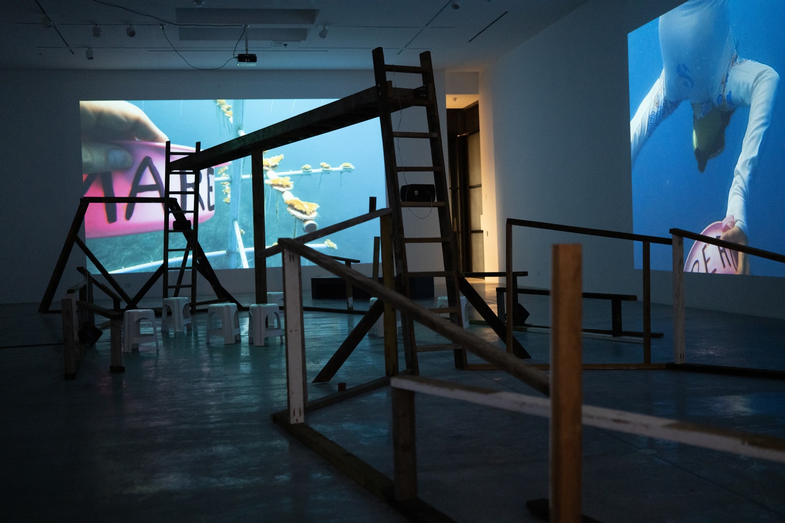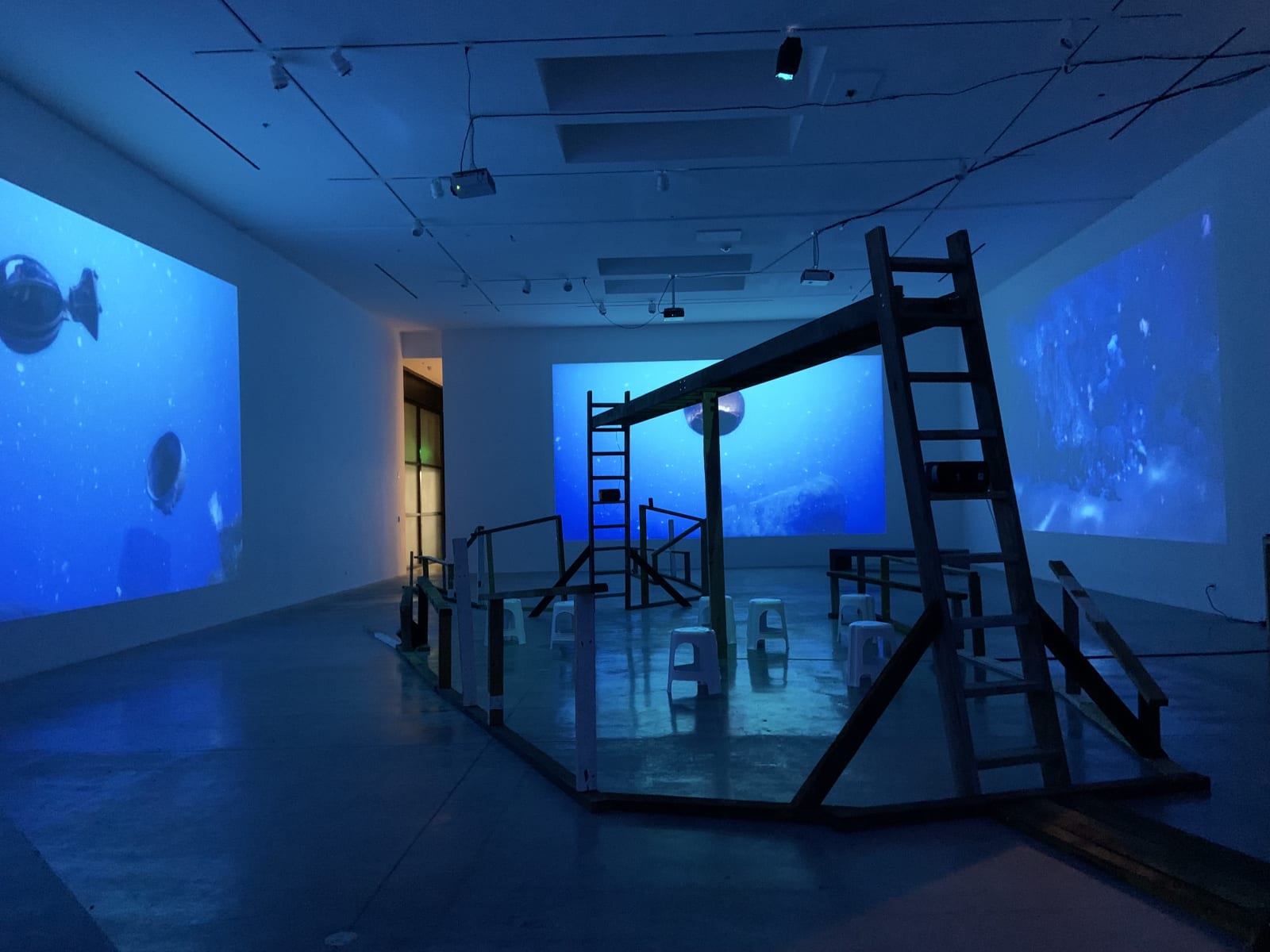 《我们的深渊亲族》通过影像、声音与雕塑形式,挑战西方科学所确立的人与自然之间的严格界限,强调人类与生态系统的不可分割。在环境正义与气候问题日益紧迫的当下,该展将深海生态置于人类争取能动性与解放的历史斗争中。艺术家的四频影像《 hydrophobia》(2024)在展场中构建出一个由梯子和横梁组成的木结构,上面摆放着制成品与现成物。整个装置既像沉船、鲸骸,又似人类神经系统,喻示深海生态中人类与非人类生命的交织。